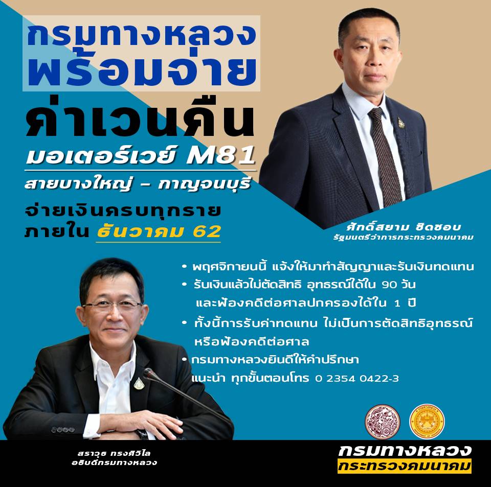 834 27/11/2562 กรมทางหลวงพร้อมจ่ายค่าเวนคืน มอเตอร์เวย์ M81 สายบางใหญ่-กาญจนบุรี ครบทุกรายภายใน ธันวาคม 62