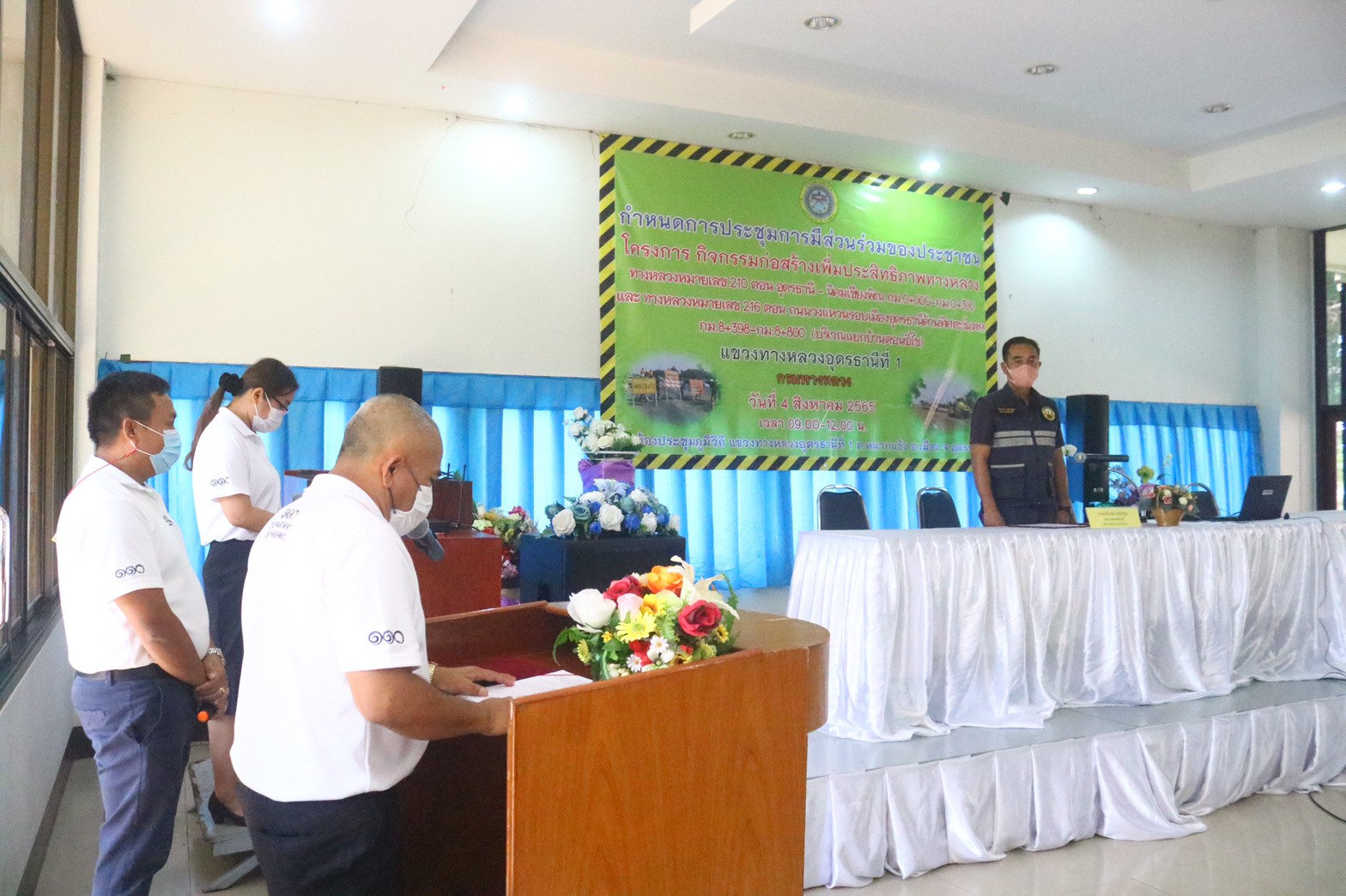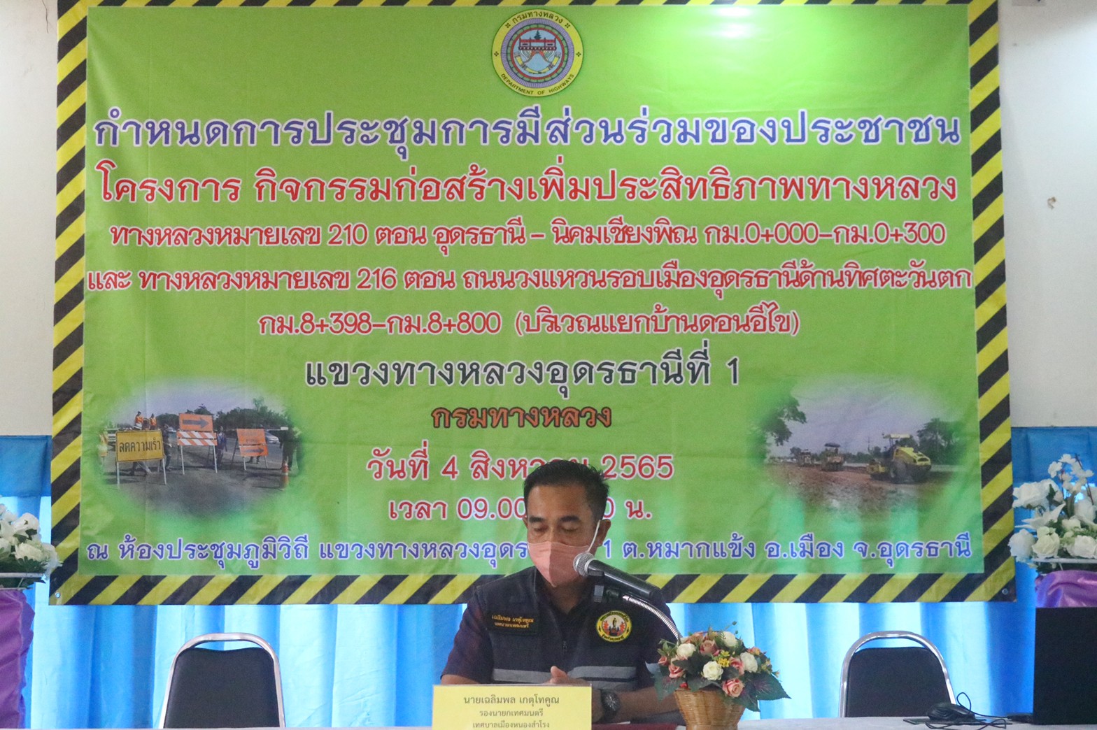 วันที่ 4 สิงหาคม 2565 เวลา 09.00 น. แขวงทางหลวงอุดรธานีที่ 1 ดำเนินการจัดการประชุมการมีส่วนร่วมของประชาชน กิจกรรมก่อสร้างเพิ่มประสิทธิภาพทางหลวงทางหลวงหมายเลข 210 ตอน อุดรธานี-นิคมเชียงพิณ กม.0+000 - กม.0+360 และทางหลวงหมายเลข 216 ตอน ถนนวงแหวนรอบเมืองอุดรธานีด้านทิศตะวันตก กม.8+398 - กม.8+800 (รวมทางแยก) ณ ห้องประชุมภูมิวิถี แขวงทางหลวงอุดรธานีที่ 1 ต.หมากแข้ง อ.เมือง จ.อุดรธานี โดยมีนายเฉลิมพล เกตุโทคูณ รองนายกเทศมนตรีเมืองหนองสำโรง เป็นประธานในพิธี วิทยากรบรรยายโครงการโดยนายศราวุธ คีรีวงษ์ วิศวกรโยธาปฏิบัติการ สำนักทางหลวงที่ 7 (ขอนแก่น) ,นายเอนก สุวรรณภูเต ผอ.ขท.อุดรธานีที่ 1 ,รอ.ขท.(ป) ,รอ.ขท.(ว) และ ชผ.ขท ผู้เข้าร่วมประชุมเป็นผู้เกี่ยวข้องและมีส่วนได้เสียในพื้นที่ก่อสร้าง ประมาณ 100 คน