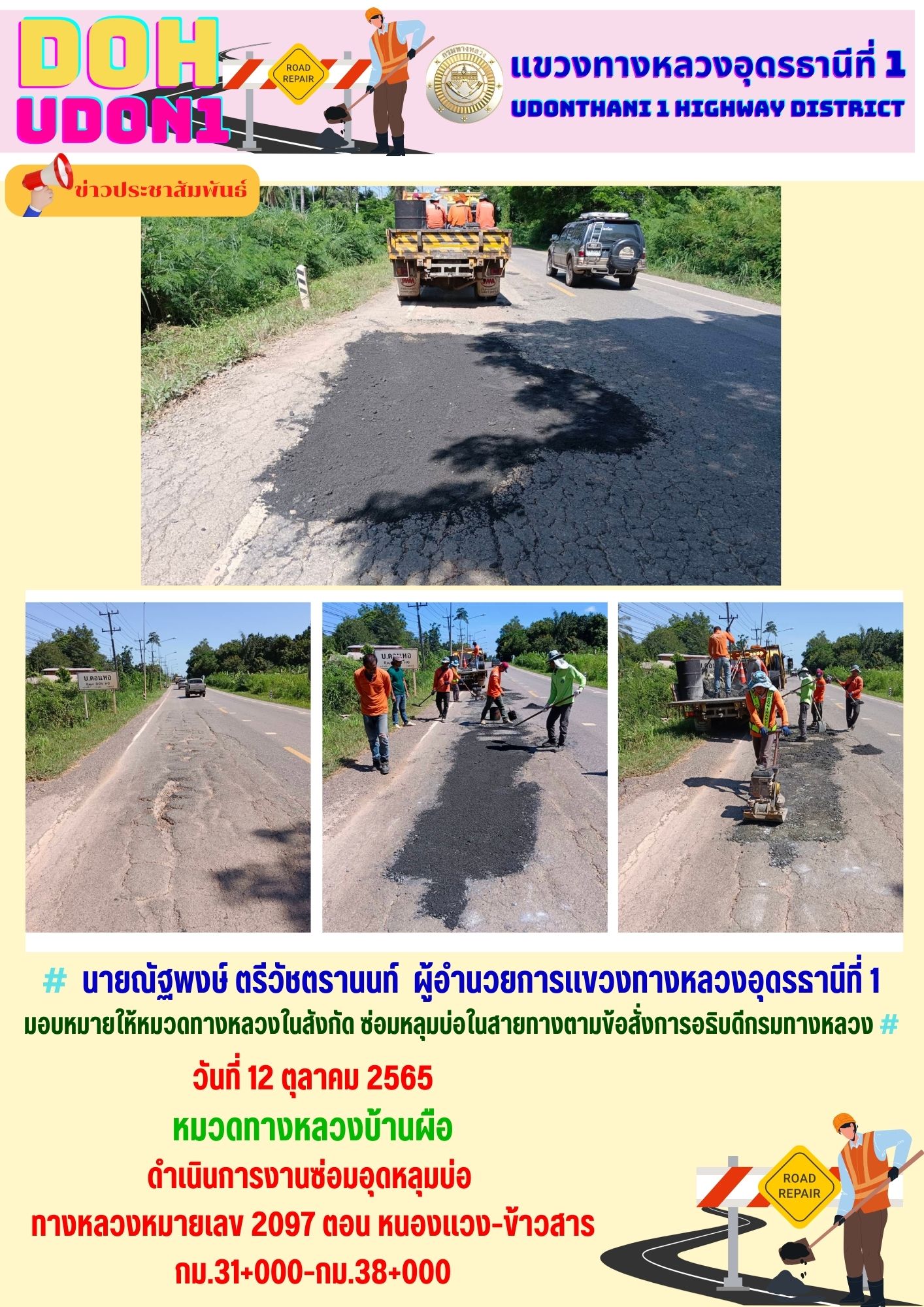 นายณัฐพงษ์ ตรีวัชตรานนท์ ผู้อำนวยการแขวงทางหลวงอุดรธานีที่ 1 มอบหมายให้หมวดทางหลวงในสังกัด ซ่อมหลุมบ่อในสายทางตามข้อสั่งการอธิบดีกรมทางหลวง