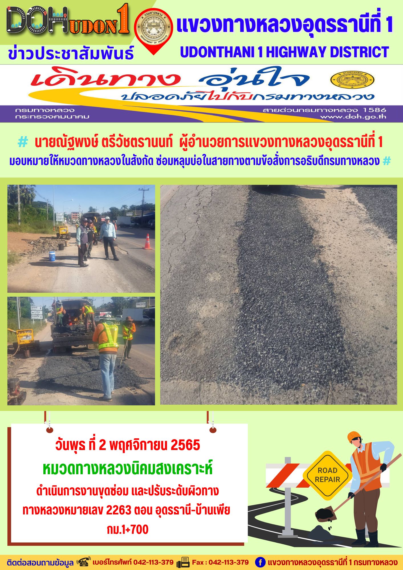 นายณัฐพงษ์ ตรีวัชตรานนท์ ผู้อำนวยการแขวงทางหลวงอุดรธานีที่ 1 มอบหมายให้หมวดทางหลวงในสังกัด ซ่อมหลุมบ่อในสายทางตามข้อสั่งการอธิบดีกรมทางหลวง