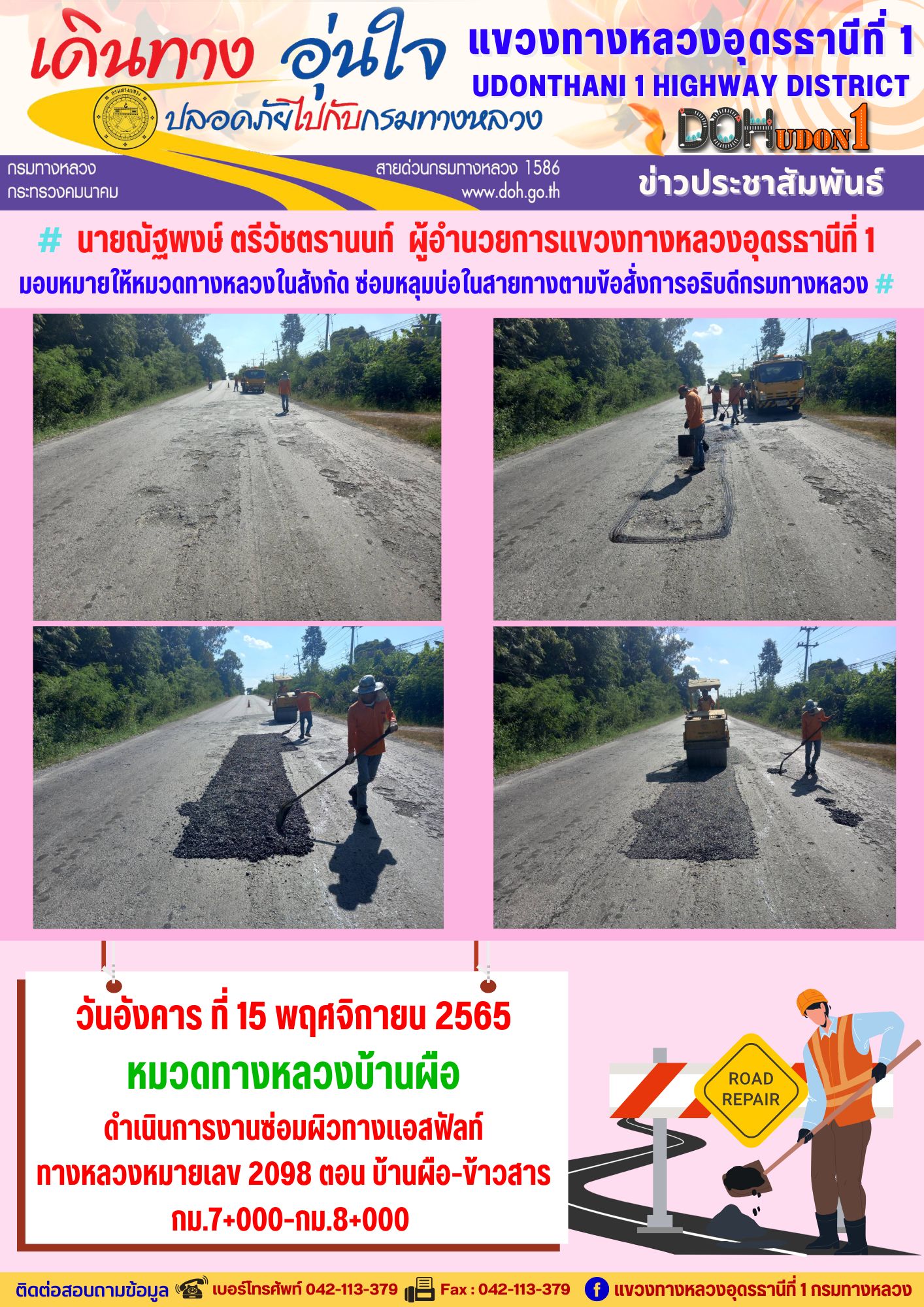 นายณัฐพงษ์ ตรีวัชตรานนท์ ผู้อำนวยการแขวงทางหลวงอุดรธานีที่ 1 มอบหมายให้หมวดทางหลวงในสังกัด ซ่อมหลุมบ่อในสายทางตามข้อสั่งการอธิบดีกรมทางหลวง