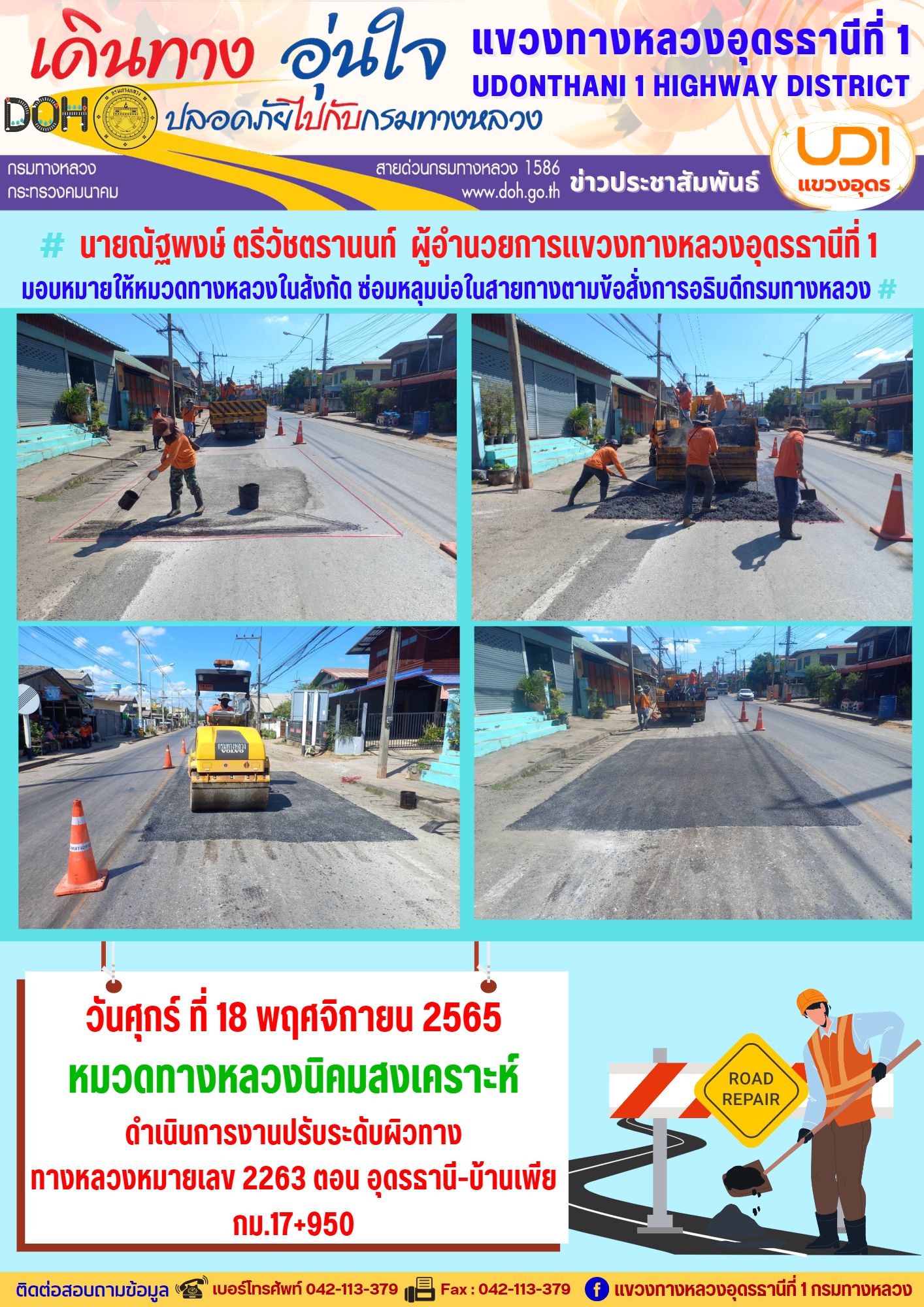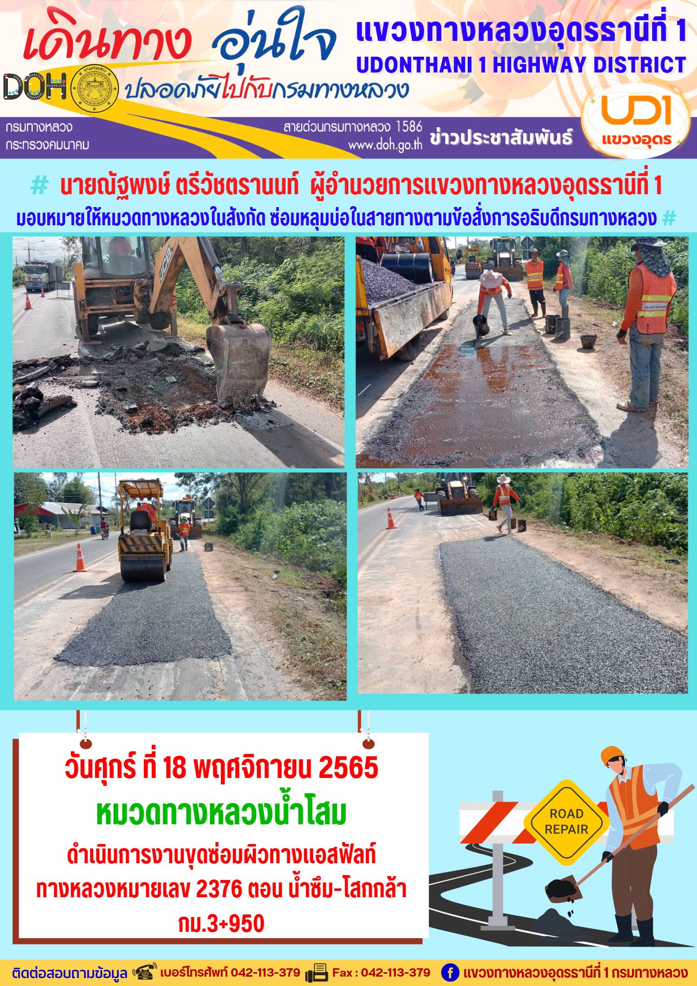 นายณัฐพงษ์ ตรีวัชตรานนท์ ผู้อำนวยการแขวงทางหลวงอุดรธานีที่ 1 มอบหมายให้หมวดทางหลวงในสังกัด ซ่อมหลุมบ่อในสายทางตามข้อสั่งการอธิบดีกรมทางหลวง