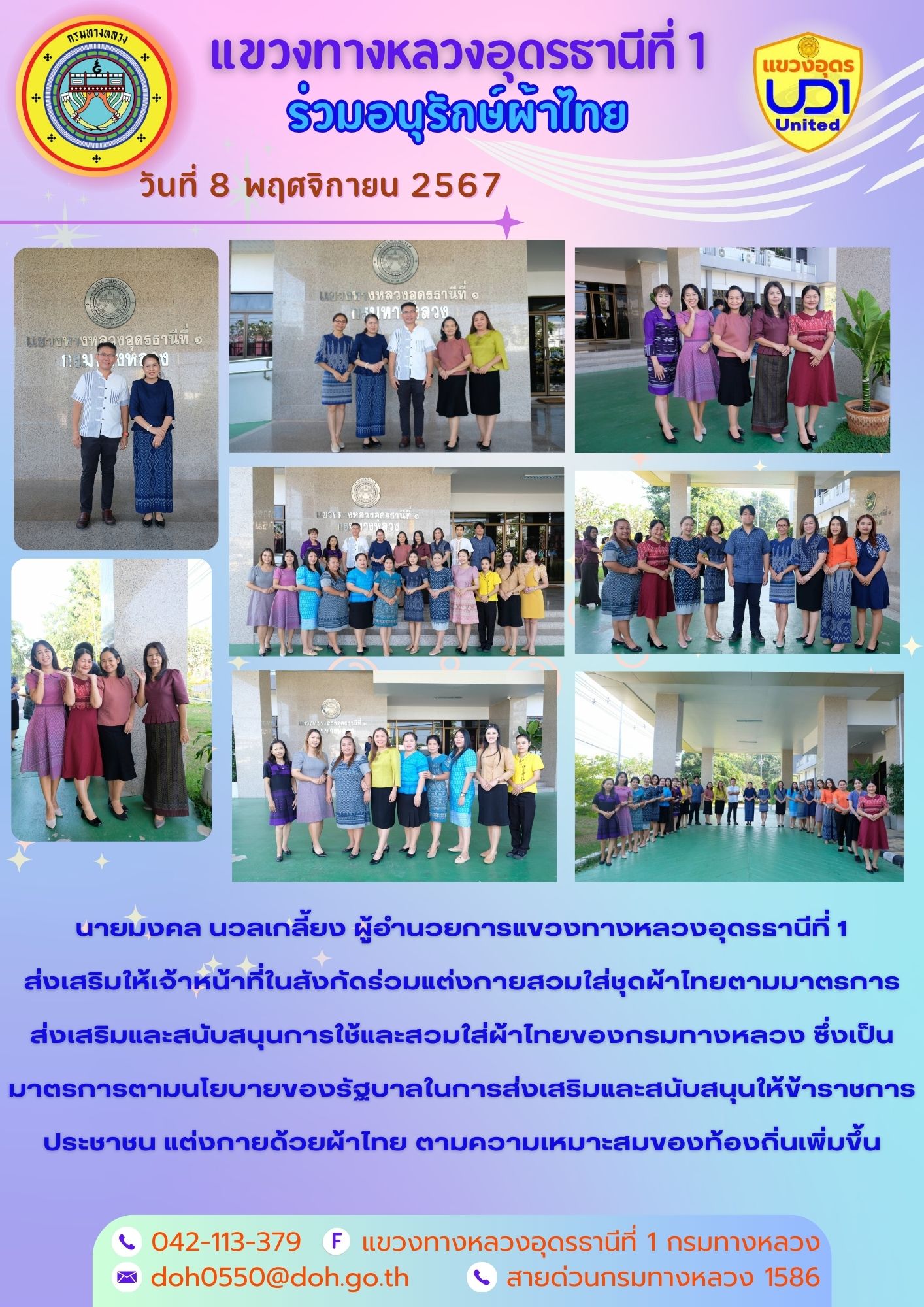 นายมงคล นวลเกลี้ยง ผู้อำนวยการแขวงทางหลวงอุดรธานีที่ 1 ส่งเสริมให้เจ้าหน้าที่ในสังกัดแต่งกายสวมใส่ชุดผ้าไทย ตามมาตรการส่งเสริมและสนับสนุนการใช้ และสวมใส่ผ้าไทยของกรมทางหลวง ซึ่งเป็นมาตรการตามนโยบายของรัฐบาลในการส่งเสริม สนับสนุนให้ข้าราชการ ประชาชน แต่งกายด้วยผ้าไทย ตามความเหมาะสมของท้องถิ่นเพิ่มขึ้น