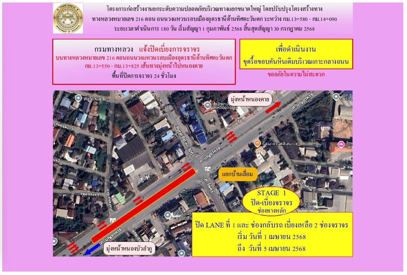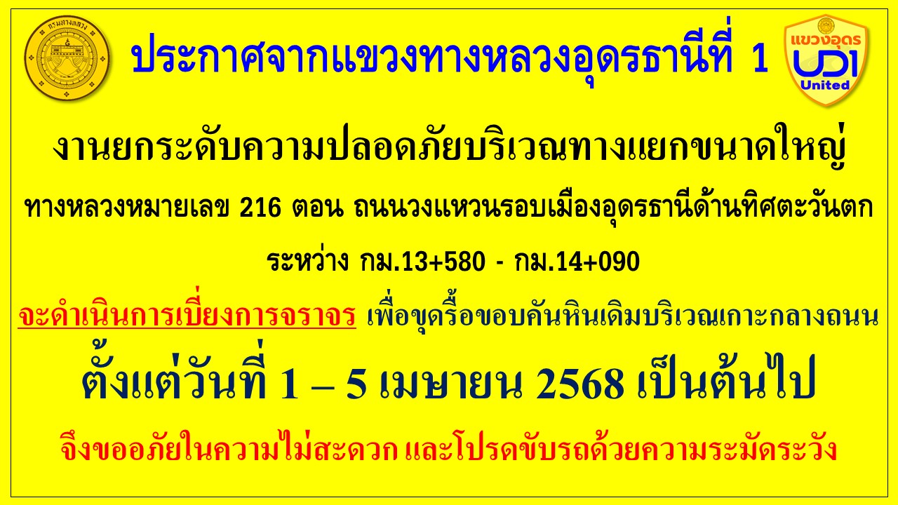 การเบี่ยงการจราจร งานยกระดับความปลอดภัยบริเวณทางแยกขนาดใหญ่ ทางหลวงหมายเลข 216 ตอน ถนนวงแหวนรอบเมืองอุดรธานีด้านทิศตะวันตก ระหว่าง กม.13+580 - กม.14+090